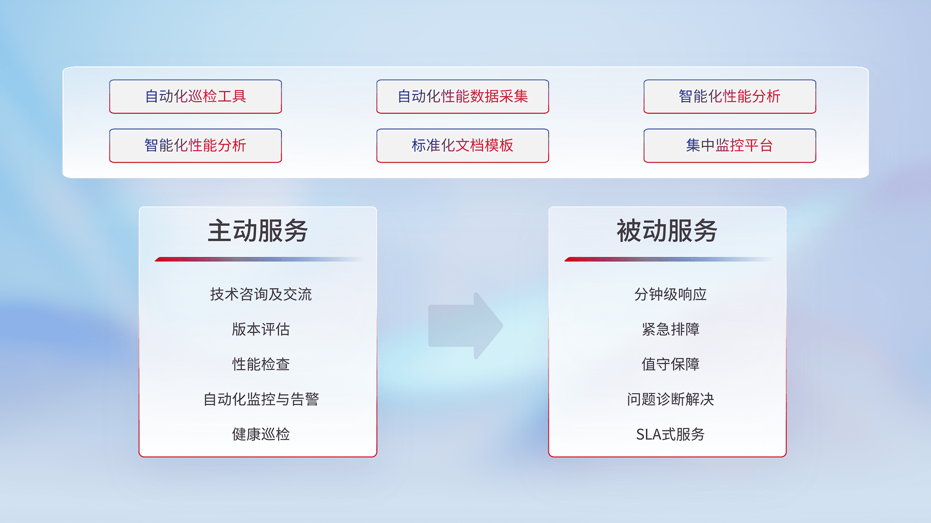 智能化工具和标准化文档,,,,保障服务质量,,,,提供主动服务(包含技术咨询、、、、版本评估、、、、性能检查、、、自动化监控与告警、、健康巡检)和被动服务包含(分钟级响应、、、、紧急排障、、、值守保障、、问题诊断解决、、SLA服务)。。。。